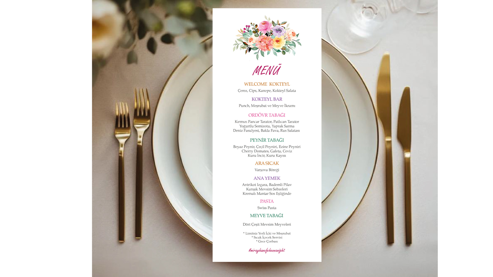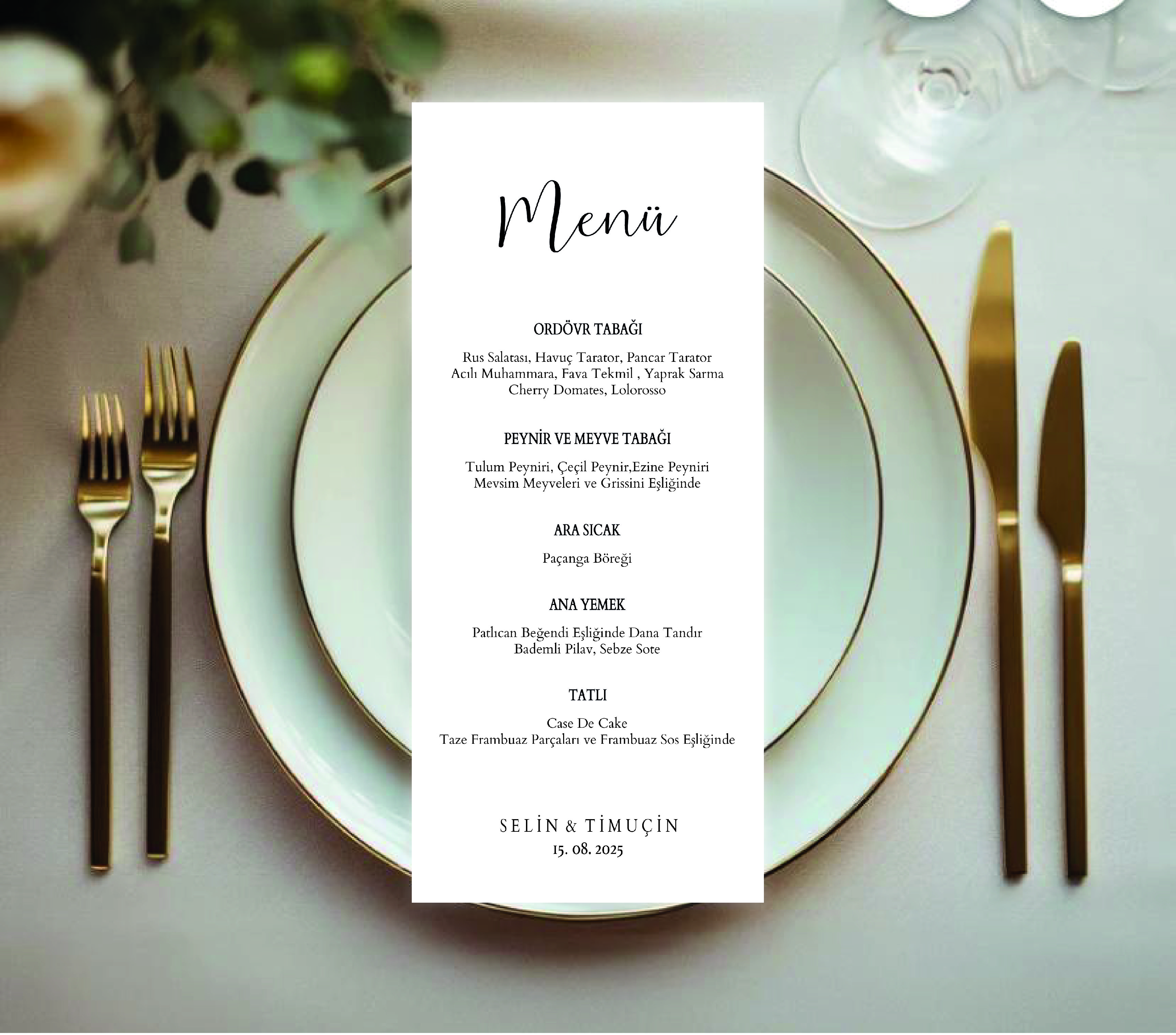 Özel tasarım minimalist menü kartı trend menü kartı modelleri arasında yer alır. Düğün organizasyonunun en özel detayları arasında yer almaktadır. Konseptinize uygun düğün menüsü seçenekleri arasından tercih yapabilirsiniz.
